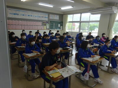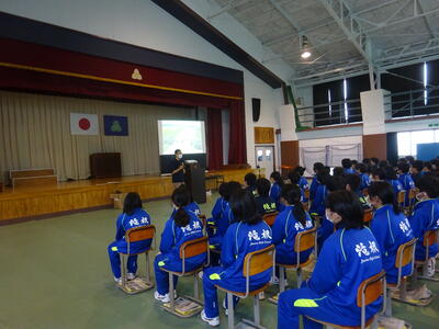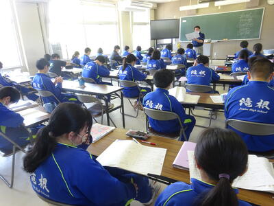 いつ起こるかわからない災害に備え、本校では毎年防災教室を実施しています。今年度は日本赤十字社福島県支部に講師を依頼し、「赤十字防災セミナー」を実施しました。講師として事業推進課の係長さんが来校し、災害への備えについて様々な視点から講話をしてくださいました。生徒たちも真剣に話を聞いていました。