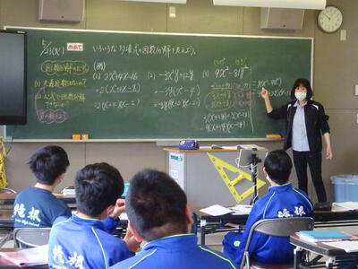 3年生の数学では少人数の学習で多項式の因数分解について学習していました。様々な方法を確認しながら、因数分解を行う際には、はじめに共通因数を確認しながら計算を行うことの大切さについて学んでいました。