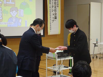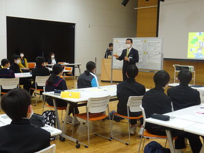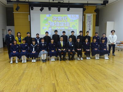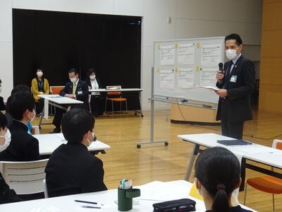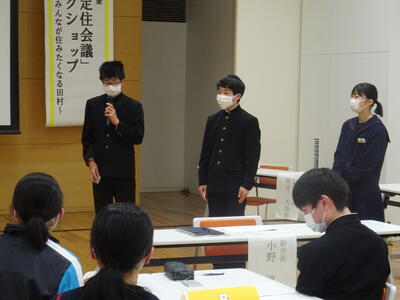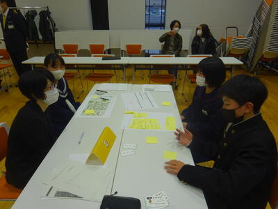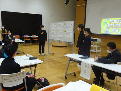 3月18日(土)午後、田村市役所1階107多目的ホールにおいて、市内中学生による「次世代移住定住会議」が行われました。この会議は、田村市を住み続けたい「ふるさと」にするために、市内の中学生同士が意見交換を行うワークショップ形式で行われました。主催は田村市企画調整課によるもので、司会や進行、生徒への支援は、3名の地域おこし協力隊の方々が行いました。本校からは生徒会、文化部の9名の生徒が参加し、現在の田村市の現状から考えた自分の思いや、将来田村市にあってほしいもの、将来の田村市のために自分たちが実施していること・実践していきたいことなどのついて話し合いました。