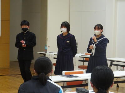 4月7日(金)、新入生が入学して2日目、生徒会による奉仕委員会や部活動など、学校生活についてのガイダンスが行われました。ガイダンスでは生徒会長のあいさつの後、生徒会のスローガンや組織についてや、奉仕委員会、生徒会行事などについて説明がありました。また、部活働紹介では各部から活動の様子が紹介されました。