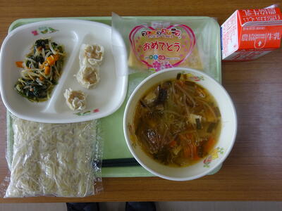 中華めん サンラータンメンスープ シュウマイ ナムル 牛乳