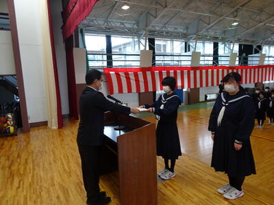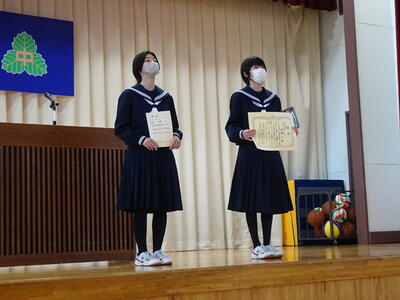 修了式終了後、今年度最後の表彰披露を行いました。書きぞめ展、音楽祭創作部門で入賞した生徒の表彰披露を行いました。