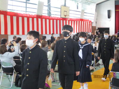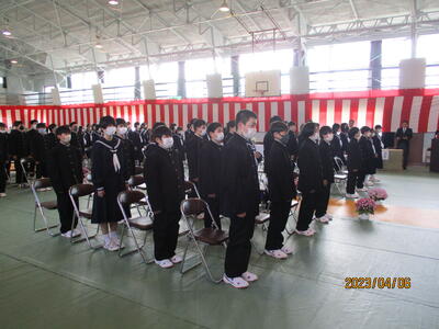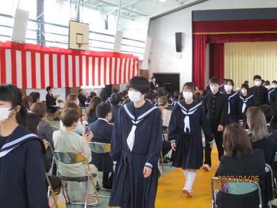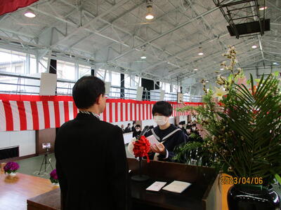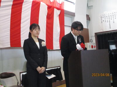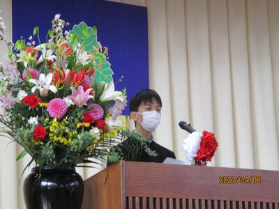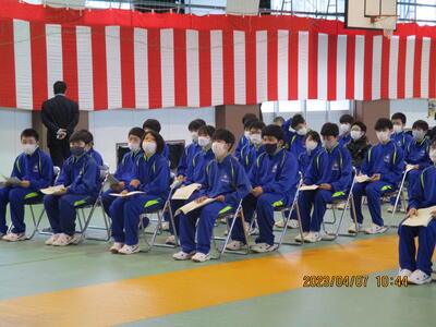 また、歓迎の言葉では、生徒会長 W・Tさんが「中学校生活では、楽しいこともあれば、苦しく、逃げ出したくなることもあると思います。一人で抱え込まず、先輩を頼ってください。」と述べ、それを受けて、誓いの言葉では、新入生代表のN・Rさんが、「難しいことや苦しいことにも逃げずに立ち向かい、乗り越えていきたい。」「滝根中学校の生徒としての自覚・責任を胸に切磋琢磨し、周りの人々との絆を深めていくことを誓います。」と力強く思いを述べました。