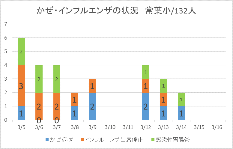 2018年3月14日 14時18分本日現時点でのインフルエンザによる出席停止はおりません。感染性胃腸炎がでています。