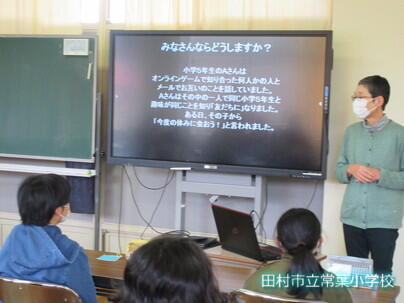 助産師の先生を講師としてお迎えして、5年生が思春期保健教室を受講しました。初めに思春期の心の持ちようについて話してくださいました。その後、子どもたちはオンラインゲームで知り合っただけの友だちから「会おう。」と誘われた場合の対応の仕方について考えました。講師の先生からは、実際に相手にどのように答えたらよいかを具体的に教えていただきました。