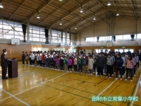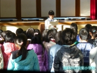 1月8日(金)午前8時30分より体育館において冬休み明け全校集会を行いました。校長先生から、「節目の日なので新しい気持ちでめあてを持ちましょう。」「何をするか忘れないようにするにはメモを取り、最後までやり遂げることが大切です。」「その時と場にふさわしい言葉づかいや礼儀作法をできるようにしましょう。」「1月下旬には学力テストがあるので学習のまとめに取り組みましょう。」「一月は行く、二月は逃げる、三月は去ると言われるように時の流れはとてもはやいので、今がんばりましょう。」というお話でした。