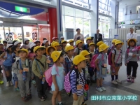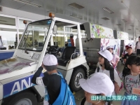 離着陸を見せてもらいました。1年生はその迫力と轟音にビックリしたようです。また,空港にしかないめずらしい自動車に乗ったり、機械類を説明してもらったりして、とても貴重な体験ができた一日でした。