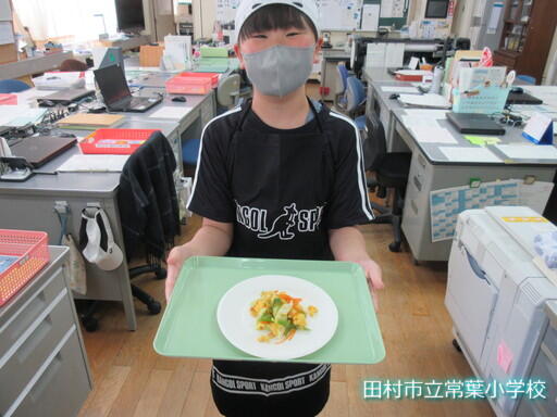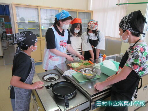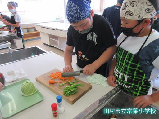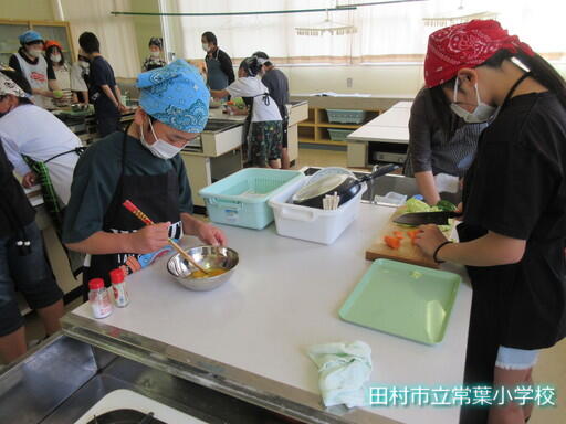 今日は5年2組が調理実習でゆで卵・ゆで野菜を作っていました。