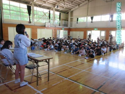 校長先生のお話があり、その後、全校生で「グループエンカウンター」を行いました。