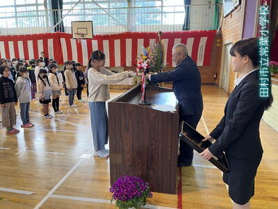 続いて始業式が行われ、校長先生から「先生方とともに勉強をがんばっていきましょう」と児童に励ましの話がありました。