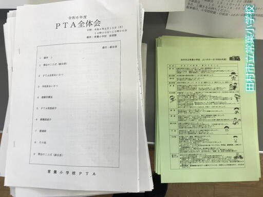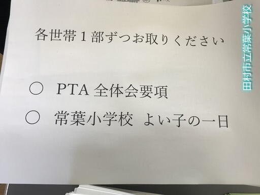 今日のPTA全体会の要項とよい子の一日を一枚ずつお取りください。