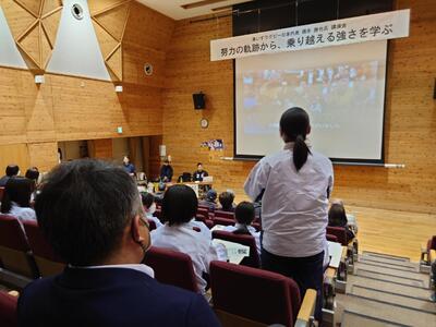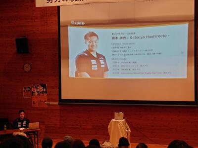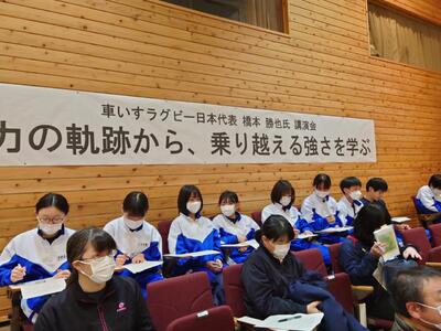 講師は三春町出身の車いすラグビー日本代表の橋本勝也氏で、演題は『努力の軌跡から乗り越える強さを学ぶ』でした。