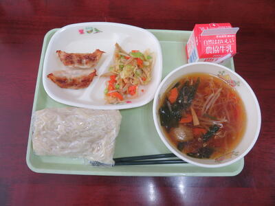 献立は、中華麺、醤油ラーメン汁、餃子、かみかみサラダ、牛乳です。