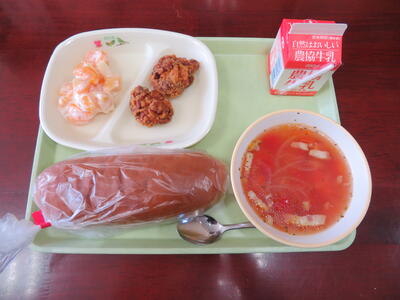 献立は、黒糖パン、唐揚げ、フルーツヨーグルト、アルファベットスープトマト味、牛乳です。
