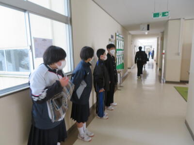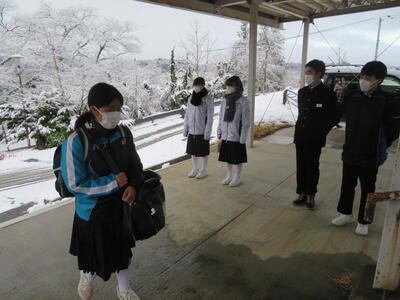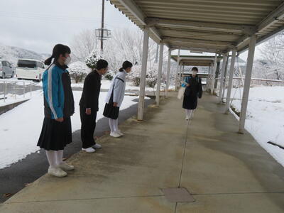 三連休明けの雪が降った朝ですが、生徒会執行部と評議委員会の生徒は、いつも通り朝のあいさつ運動です。