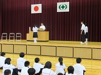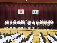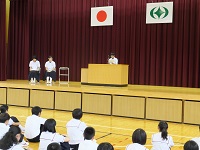2018年8月27日 09時56分夏休み明け初日に、後期全校集会・英語弁論大会激励会を行いました。各学年代表生徒による夏休みの生活と今後の抱負の発表がありました。その後、29日に行われる英語弁論大会に参加する生徒の発表を行い、生徒会副会長から激励のことばの発表がありました。また、田村地区中学校音楽祭において優秀賞を受賞し、県大会に出場する特設合唱部による合唱曲「それでは計算いたしませう」の発表があり,すばらしい歌声が披露されました。